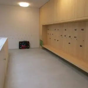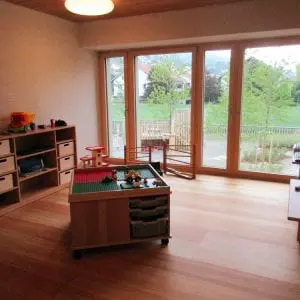 Statt fixen Gruppenzimmern bietet unser Konzept anregende „Funktionsräume“, in denen sich die Kinder selbständig bewegen können. Die Raumgestaltung berücksichtigt die Bedürfnisse verschiedener Altersgruppen. Die Kinder können jederzeit frei die Räume wechseln, sie können sich zurückziehen, Gruppen bilden, sich allein oder gemeinsam in ihr Spiel vertiefen. Dabei sind die Zimmer so flexibel eingerichtet, dass sie von Zeit zu Zeit an Wünsche und neue Bedürfnisse der Kinder angepasst werden können. Für jeden Raum ist jederzeit eine Betreuungsperson zuständig – als Ansprechperson und um nach dem Rechten zu sehen. Die Räume der Kita liegen im Obergeschoss, die der Tagesstrukturen im Erdgeschoss. Zwei Lichthöfe mit Fenstern bringen nicht nur Licht in die inneren Räume, sondern lassen auch Blickkontakte zwischen den Etagen zu.