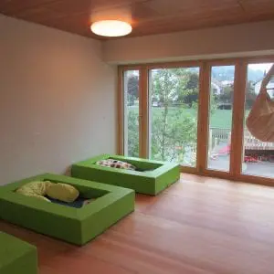 Weil Kinder andere Bedürfnisse haben als Erwachsene, haben sie bei uns auch andere Räume: Räume, die auf kindgerechte Weise Orientierung und Sicherheit vermitteln. Aber auch Räume, die tausend Möglichkeiten bieten – vom „Bewegungsraum“ über den Bastelraum bis zum ruhigen Rückzugsraum. Für die Säuglinge steht ein eigener, ruhiger Bereich mit der nötigen Infrastruktur zur Verfügung.