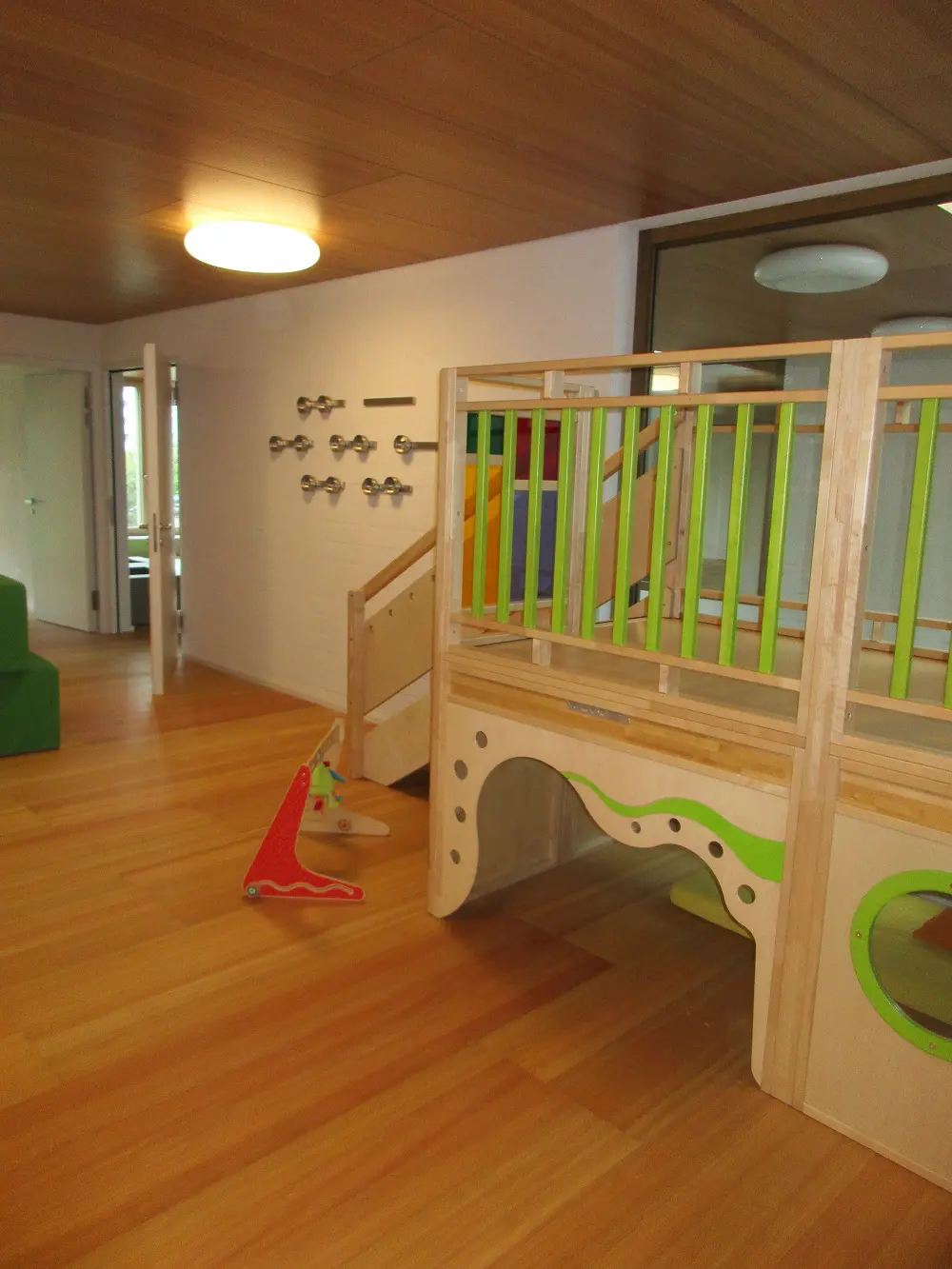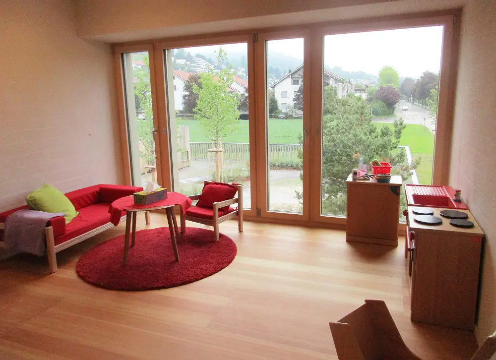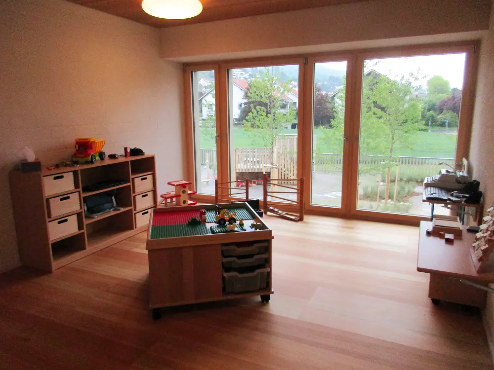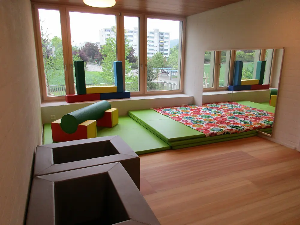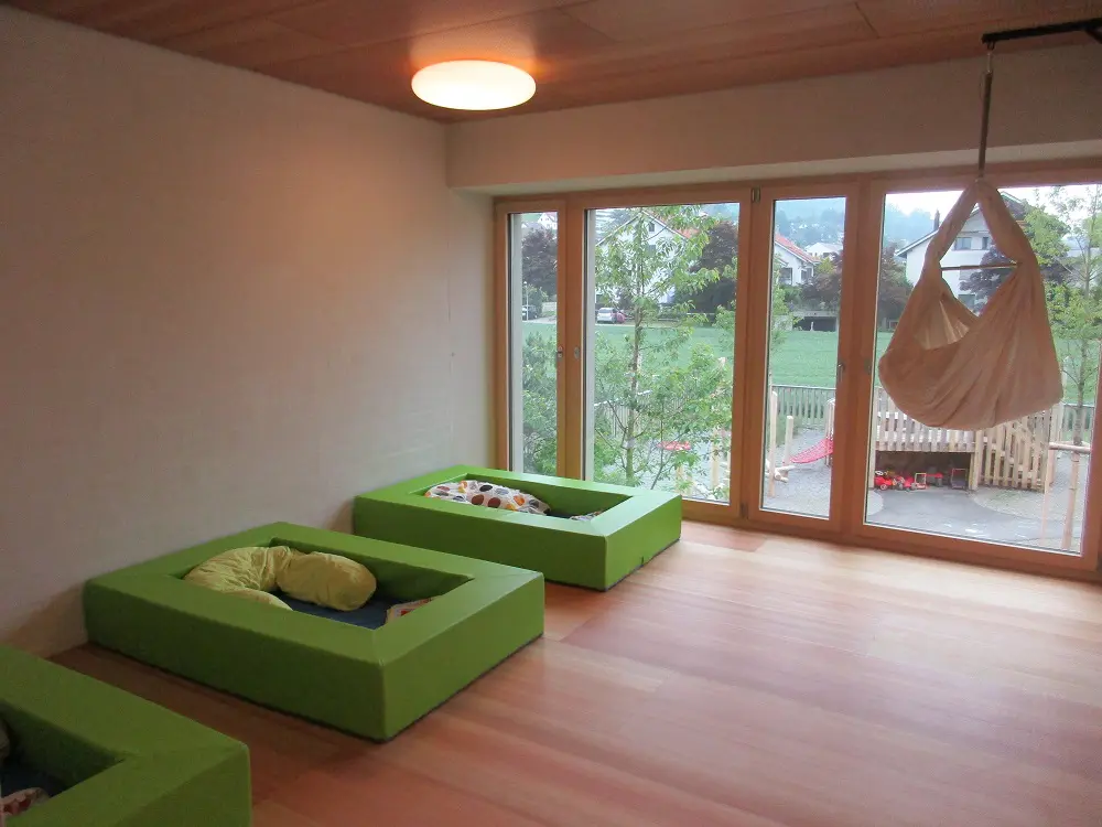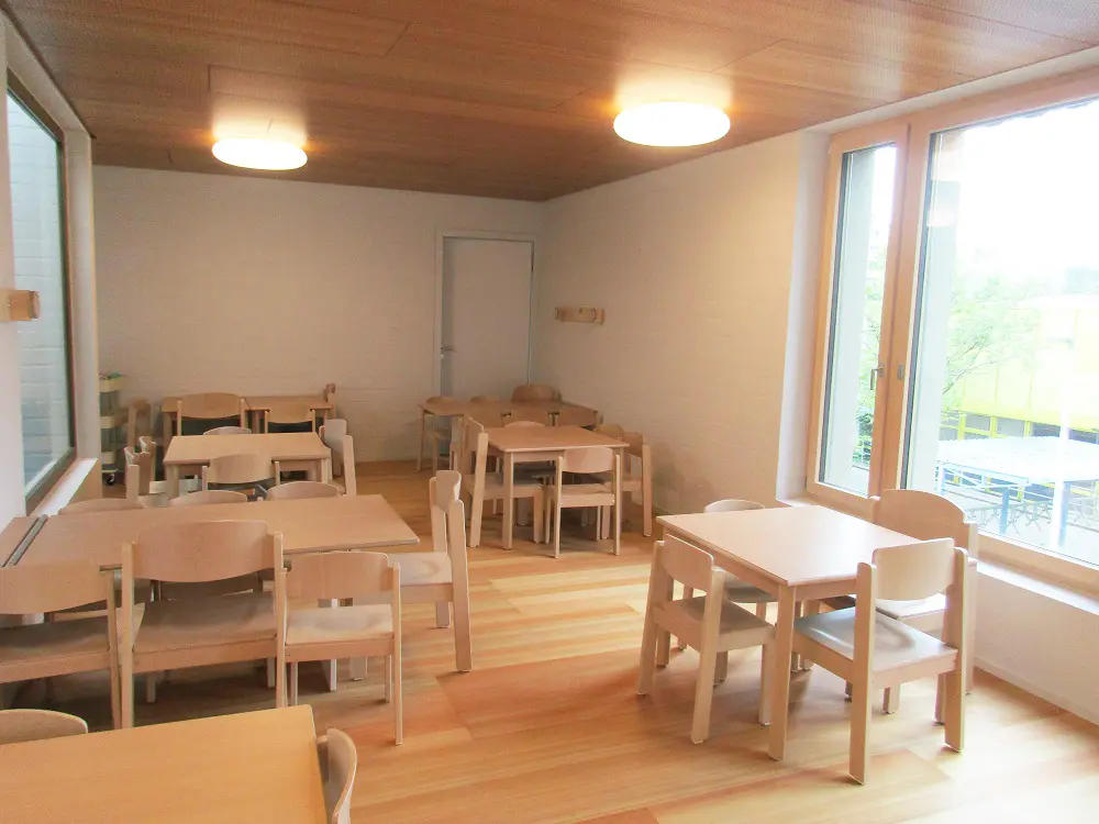 Statt fixen Gruppenzimmern bietet unser Konzept anregende „Funktionsräume“, in denen sich die Kinder selbständig bewegen können. Die Raumgestaltung berücksichtigt die Bedürfnisse verschiedener Altersgruppen. Die Kinder können jederzeit frei die Räume wechseln, sie können sich zurückziehen, Gruppen bilden, sich allein oder gemeinsam in ihr Spiel vertiefen. Dabei sind die Zimmer so flexibel eingerichtet, dass sie von Zeit zu Zeit an Wünsche und neue Bedürfnisse der Kinder angepasst werden können. Für jeden Raum ist jederzeit eine Betreuungsperson zuständig – als Ansprechperson und um nach dem Rechten zu sehen. Die Räume der Kita liegen im Obergeschoss, die der Tagesstrukturen im Erdgeschoss. Zwei Lichthöfe mit Fenstern bringen nicht nur Licht in die inneren Räume, sondern lassen auch Blickkontakte zwischen den Etagen zu.